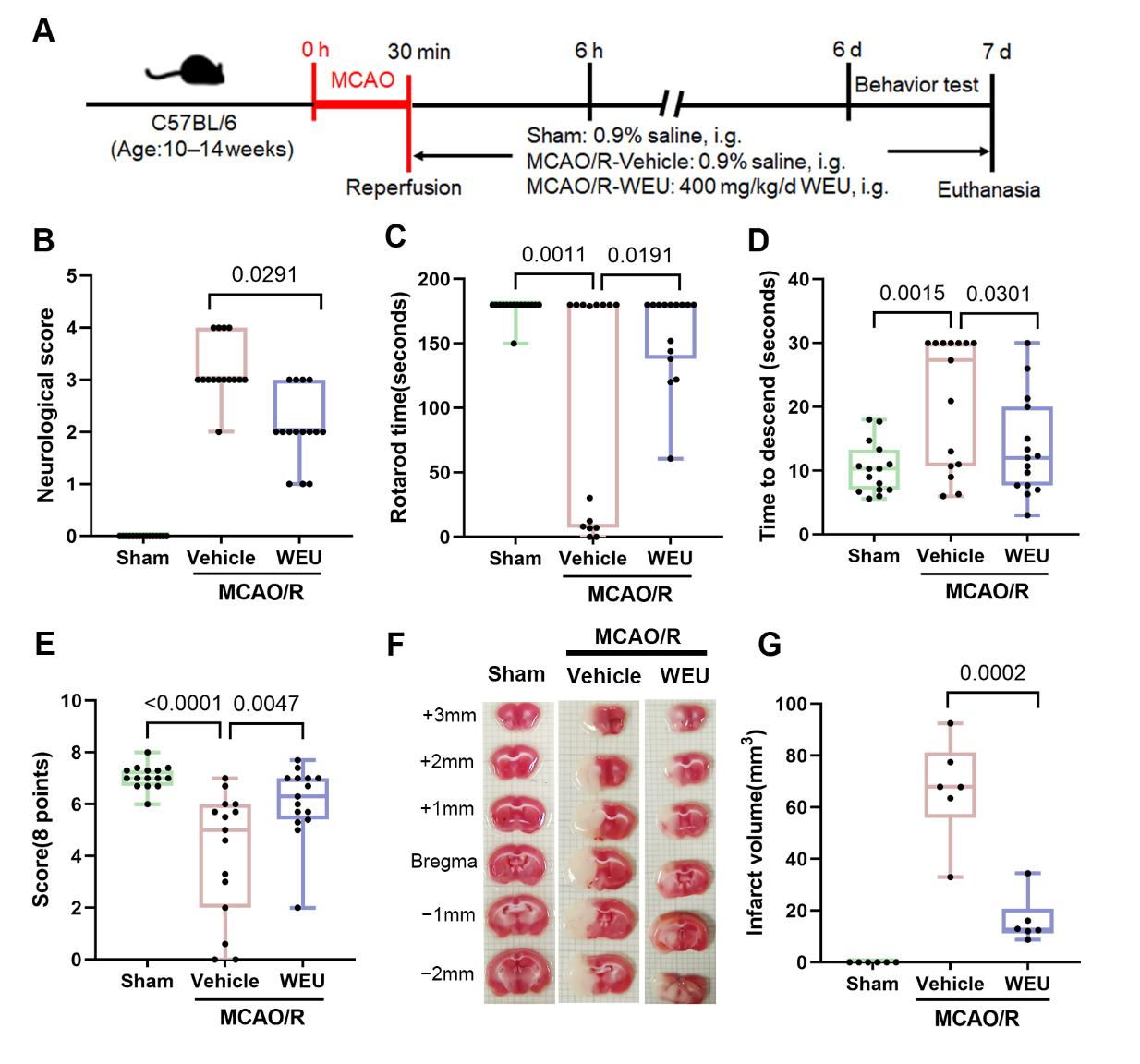 图2 杜仲提取物改善脑血栓造成的行为缺陷并降低脑梗死体积